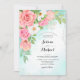 Beautiful roses, tulips, anemone, cosmos flowers with leaves and twigs forming rich bouquets. Turquoise watercolor ombre. Shades of pink, peach, green, turquoise. Fine art watercolor artwork. Elegant lettering. Modern geometric elements. Joyful and festive wedding design, ideal for summer wedding. Pink (coral) and turquoise s a timeless classic wedding colour theme.