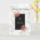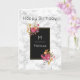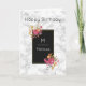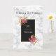 A birthday card with your recipient's monogram initial and name. A black frame with a thin gold coloured border. Illustrated with flower bouquets in the corners. The flowers are pink and orange with sprigs and leaves, looking fancy and elegant. A personalised birthday message inside the card which you can change or leave as is.