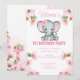 Pink Floral Elephant 1st Birthday Invitation