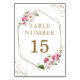 Elegant table number featuring beautiful pink flowers with faux gold foil hexagon frame on a white background.