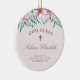 Watercolor blush pink magnolia flowers, green foliage, and eucalyptus leaves and a classy handwritten style calligraphy script making a beautiful girl baptism personalised Christmas keepsake tree ornament.