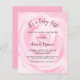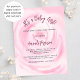 A close-up of a watercolored soft pink rose, flower. Personalise and add the name of the mum-to-be and party details.