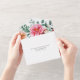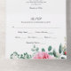 A beautiful floral design with pink peonies and eucalyptus greenery in an all in one wedding invitation. Your guests can tear off the RSVP card and mail it back. All fields are editable.