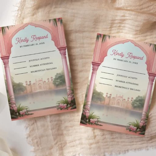 Elegant wedding RSVP card featuring beautiful pink flowers and vintage Indian arches with modern typography.