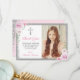 Pink Floral Silver First Holy Communion Photo Thank You Card