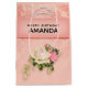 A birthday gift bag with a floral rose bouquet with white and pink flowers. A faux diamond tiara. Background is pink with a floral pattern. Pretty and elegant design.