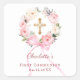 A white background, decorated with watercolored pink and ivory flowers in a wreath and a golden cross. A pink bow. Personalize and add the name and date.