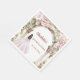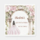 A large marble arch decorated with pink florals. A girl with a light pink dress. Personalize and add a text, name, date.