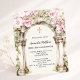 A large marble arch decorated with pink florals and a golden cross. Personalise and add a name and details.