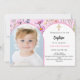 Add your own vertical size photo. A pink arch shaped photo frame. Decorated with pink flowers and a golden cross. Personalise and add a name and details.