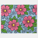 The design features large stylized flowers with rounded petals and a bright circular center. The flowers are drawn with thick black outlines that give them a clear, graphic look. Surrounding the flowers are smooth leaves with simple vein details, also outlined in black. Curved decorative lines and small dot-like shapes add a playful, flowing feeling to the design. The color palette includes strong pink for the flowers, fresh green for the leaves, warm yellow for the centers, and a calm light blue background. The contrast between the bold outlines and flat colors creates a lively and cheerful visual style with a slightly whimsical character.