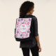 A personalised backpack with a cute floral pattern. Composed of pink and purple irregular shaped flowers in a retro sixties groovy style. Faint faded little blue hearts,
