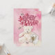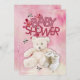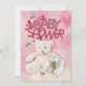 Pink and white paper background, a white bear and white baby booties, pink flowers and glitter butterflies. And of course the wordart "Baby Shower" in textured in pink glitter. You can customise the text on the back of this cute design to make this your personalised babyshower invitation!