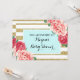 Personalised baby shower invitations in light blue and white with gold stripes and pink watercolor flowers (please note glitter is photographic effect only, not actual glitter).