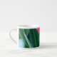 Espresso in the garden - the original photograph by MaeFlowers on this brightly coloured Espresso Cup is a closeup of pink flowers against green leaves, with a touch of light blue sky showing through. In the photo, the flower petals are wide open. The flower's centre is a soft yellow ivory blending into pink at its ruffled outer edges.
