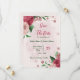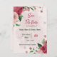 Beautiful romantic wedding save the date invitation featuring pink and dusty rose flowers and some green leaves .