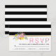 This gorgeous floral wedding RSVP response card features pretty pink and yellow flowers with greenery foliage and a black and white striped pattern. Your text is on a white band with a gold stripe.