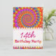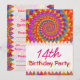 Birthday Party Invitations with a psychedelic hippy style fractal pattern in pink turquoise and yellow.