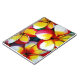 with original art design from watercolour painting by Sacha Grossel of tropical pink, yellow and white frangipani flowers in close focus, macro style. This bright, colourful, floral botanical design is reminiscent of summer, surf culture, hot weather and being near the beach.