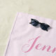 This beach towel features Destei's original illustration of a lovely pink frangipani flower with two green leaves. The background colour is light pink with a sand pattern on the bottom. On the top there is a personalizable text area for a name in a beautiful script font.
