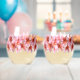 Pink frangipani decorated drink glasses. Perfect for a bridal shower or any pre-wedding party or day-of reception. Realistic pink Hawaiian plumeria blooms wrap around stemless wine glasses.