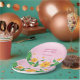 Tropical wedding theme paper plate design featuring Destei's illustrated pink and orange colour frangipani plumeria flowers with green leaves. The background colour is pink and there are personalizable text areas for the date of the wedding and for the names of the couple who is getting married.