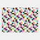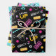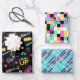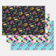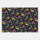 A coordinating retro gaming wrapping paper set in aqua blue, yellow and pink. Great for both boys and girls that like playing video games. Included is a gaming icon collage, a pixelated pattern and a playful laser beam design.