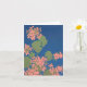 A notecard with a screenprinted design of salmon pink geraniums on a deep blue background. Left blank inside for your own message.