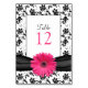 Use the personalise option to change the table number on these pink gerbera daisy black floral damask and ribbon wedding or other special occasion table cards. Please NOTE: You MUST change the table number on each card and add one of each number to your cart. If you want to do more extensive changes including changing the font, font colour, or font size, use the customise option.
