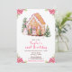 This elegant and festive birthday party invitation features a watercolor gingerbread house and beautiful pink poinsettia flowers. The text combines handwritten script and sans serif fonts for a stylish and modern look. The snowman, decorated pine trees and holiday wreath add a festive touch. This is perfect for Christmas birthday parties.
