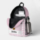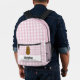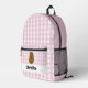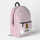 Adorable backpack featuring a cute happy cartoon brown potato. The background is a cute classic pattern of pink and white gingham. A template below the potato to add your name.
