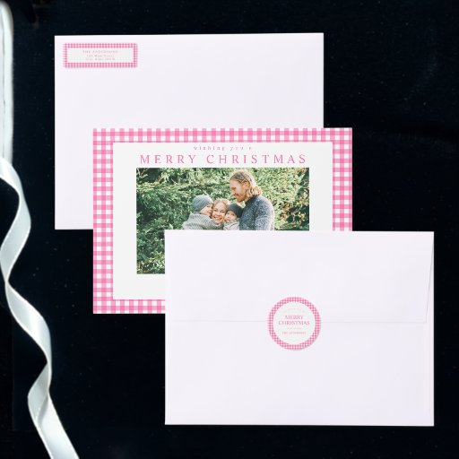 Pink Gingham Plaid Two Photo Holiday Card
