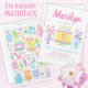 5th birthday yellow and pink cake with the number 5 on the cake. The number 5 is added to cakes and presents throughout the design. Customise the name in a casual pink script to highlight the birthday girl.