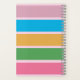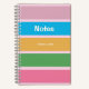 A pink, girly notebook with colourful stripes and text that reads "NOTES" and a custom monogrammed full name.