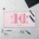 Desk mat with a glitzy shiny bow with gold outline and a faceted pink gemstone in the centre. Feminine luxury glam style.