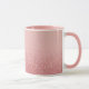 This is a Combo Mug with a pink interior. The top of the mug is a light pink colour that becomes a sparkling rose gold glitter texture at the bottom. The glitter creates a shimmering effect with sparkles giving the image a glamourous aesthetic. The glitter particles vary in size and intensity creating a quality sparkle effect. The mug is a combo mug with a pink handle and pink interior.