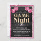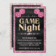 This custom ladies game night invitation features a glamourous and sparkly theme over a black, foil style background. The phrase "Game Night" is printed in gold, with a band of diamonds below it. Two sets of pink glitter dice are printed at the top in each corner. The border is a luxurious sequins pattern.