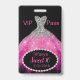 Glam Sweet 16 VIP guest badge, with graphics of a pink and silver glitter gown and a diamond framed black oval text area, on the bottom. Personalise the hot pink text to suit your needs. Great for birthday parties, bachelorette parties, more.