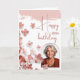 Pink Glitter Flower Floral Photo 80th Birthday Card. The design has beautiful blush pink flower blossoms in pink faux glitter and a birthday wish inside the card. A custom photo is in an arc frame. The text is fully customisable.