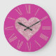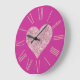 This glamorous and girly wall clock features a bright fuchsia background with a faux pink glitter heart in the center. The hours are printed in a pink glitter Roman numeral design.