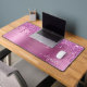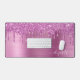Custom monogram desk mat featuring pink faux glitter dripping on a pink faux brushed metallic background. Personalise with your name in an elegant white script with swashes.