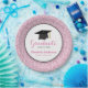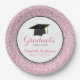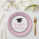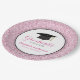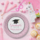 This graduation paper plate offers a girly design with a pink faux glitter border and accented with a graphic of a graduation hat. Custom text allows you to personalise with the graduate's name, graduating year and school.