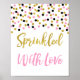 Sprinkled with love sign for baby sprinkle in a gold, pink and black confetti pattern.