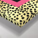 Create a touch of glamour with this elegant 24x24 inch black and gold cheetah print hair and beauty boutique wrapped canvas business information sign with a gold silhouette of a woman with long wavy hair. Who can resist a pair of trendy hot pink shoes with bows? She is admiring her reflection in a vanity mirror. Personalise this chic animal print design by adding the name of the certified beautician or hair stylist, as well as your boutique hours. Flat printed image, NOT reflective metallic.