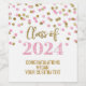 Graduation party custom wine bottle labels class of 2024 with pink and gold glitter pattern confetti.