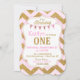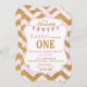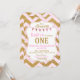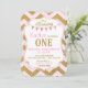 Bold pale pink and gold glitter-look chevron print with birthday banner sign over a gold one lettering modern birthday invitation card design.