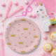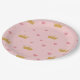 This paper plate features a soft pastel pink background decorated with a whimsical pattern of gold glitter-style crowns and rosy pink hearts. The crowns vary slightly in size and are evenly spaced throughout the design, while the hearts and tiny pink dots add a playful, delicate accent. The overall pattern is seamless, balanced, and feminine—perfect for princess-themed celebrations, baby showers, or first birthday parties.