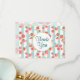 A thank you card with a repeating digital pattern of pink grapefruits created with watercolors, set on a pastel green and white striped pattern, A white circle with a gold coloured border in the centre with your personalised text.