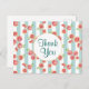 A thank you postcard with a repeating digital pattern of pink grapefruits created with watercolors, set on a pastel green and white striped pattern. A white circle with a gold coloured border sits in the centre with thank you written in the centre. The back has a thank you message. All text is customisable to suit your personal situation.