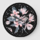 A clock with an elegant pattern made with a watercolor illustration of pink flowers with blue-gray leaves and stems.